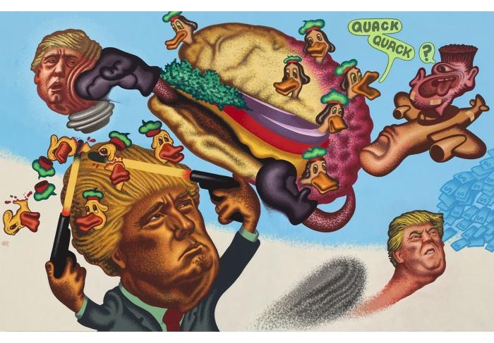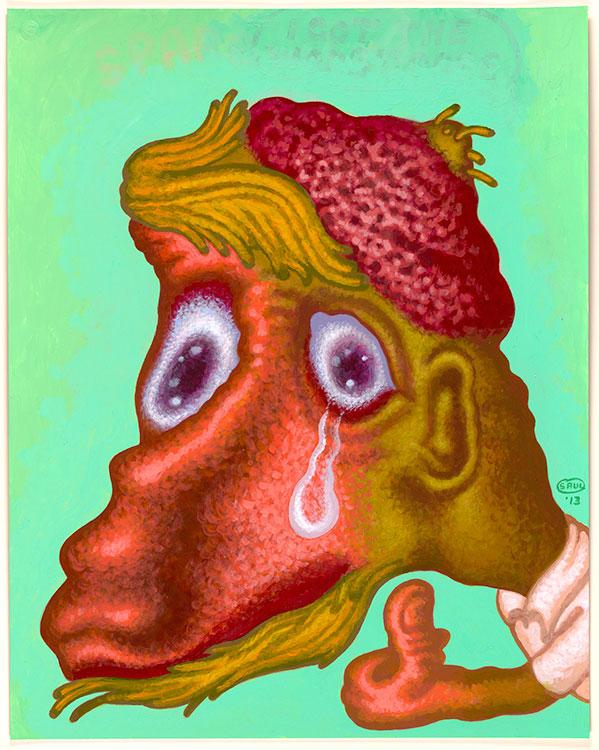 Peter Saul's portraits paintings vividly reflect his unique approach to art, characterized by a blend of satire, vibrant colors, and a critical eye on American culture and politics. Saul's work is deeply infused with influences from pop culture, surrealism, and expressionism, making his portraits far more than mere representations. Instead, they often serve as pointed critiques or exaggerated caricatures of political figures, celebrities, and various societal archetypes.