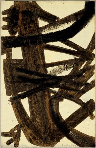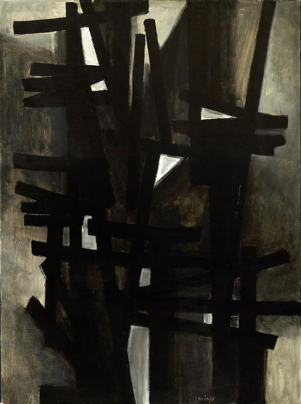 After World War II, Soulages moved to Paris and began to establish himself as a formidable presence in the art world. His early works from this period exhibit a bold, gestural style that reflects the influence of Art Informel and Abstract Expressionism, movements that emphasized the emotional and physical act of painting. Soulages was fascinated by the textures and rhythms of nature, as seen in his depictions of tree branches against stark winter skies. These early paintings already hinted at his interest in the dramatic interplay between light and dark, a theme that would dominate his later work.