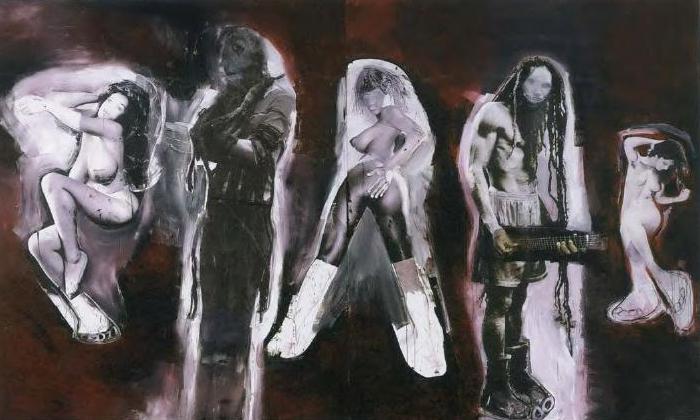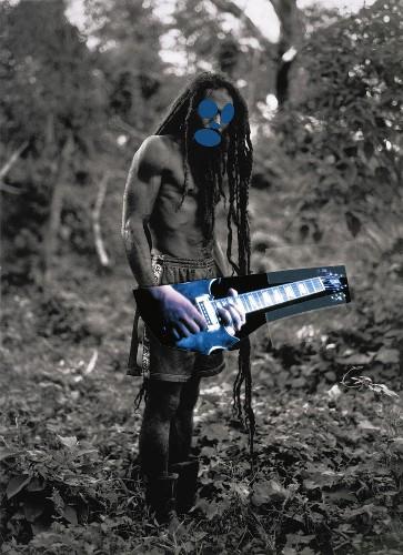 The series was first showcased at Gagosian Gallery, New York, presenting an anarchic tropical scenario filled with fleshy female pin-ups, Rastafarians, electric guitars, and black bodies. This blend of imagery offers a chaotic, yet deeply personal look at Prince's own conceptualization of his birthplace—a U.S. political exclave until 1979, portrayed as a mix of colonial and socialist influences. The artworks themselves, like "Naked Confessions" and "Back to the Garden," feature a combination of scanned and directly printed images on canvas, alongside roughly cut and pasted figures, overlaid with expressive paint swipes and oil-stick crayon scribbles. This method represented a novel approach for Prince, where the process's incidental outcomes became a significant aspect of the artwork (Gagosian).