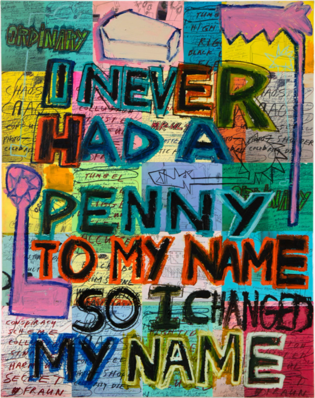 Created during the pandemic between 2019 and 2021, Prince's works integrate Dangerfield's jokes with bold oil stick lettering set against a backdrop of the comedian's stage notes, transforming these into readymade collages. This process not only highlights Dangerfield's acute observations of contemporary life but also parodies and exposes the cultural norms and stereotypes prevalent within society. The exhibition features paintings that are rich with graffiti-like imagery and text, incorporating motifs from Prince's own repertoire such as the Hippie Drawings, Protest Paintings, Cheque Paintings, and High Times. This melding of content forms a cynical view of Americana and its identity, where jokes sometimes disintegrate into phrases that suggest deeper societal issues (FAD Magazine) (Ocula Art).