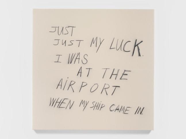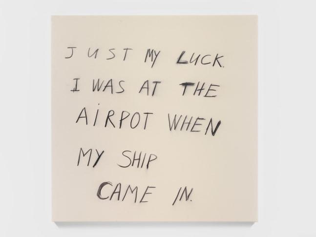 The series showcases Prince's return to incorporating jokes into his artwork, a practice he began in the 1980s. This time, he appropriates a deadpan joke from legendary stand-up comedian Rodney Dangerfield, "Just my luck. I was at the airport when my ship came in," expressing it through hand-written charcoal inscriptions on large, raw canvases. The repetition of the joke across the series not only emphasizes its humor but also invites reflection on its deeper, perhaps melancholic implications about luck and missed opportunities (Nahmad Contemporary) (Tarmak22).