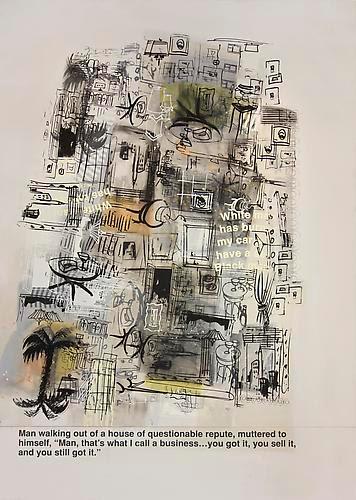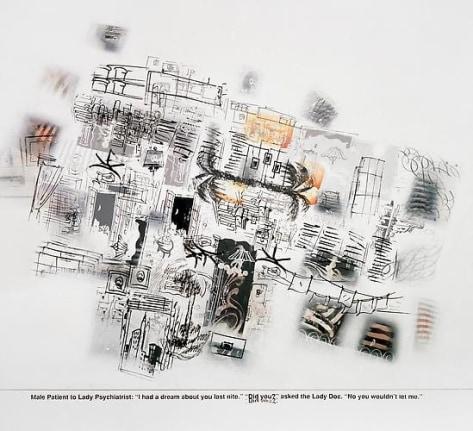 In the "White Paintings," Prince integrates handwritten and printed jokes, gestural marks, silkscreened imagery, and graphic fragments, all laid over a backdrop imbued with painterly white textures. This series showcases Prince's manual involvement through spirited whorls and the presence of his hand-written text, signifying a personal touch contrasting with the detached nature of his appropriation work. These paintings reflect Prince's affinity with the gestural and expressive qualities of American painters from the 1950s, such as Cy Twombly and Robert Rauschenberg, blending appropriation with a homage to the spontaneity and rawness of their styles (Skarstedt) (Skarstedt).