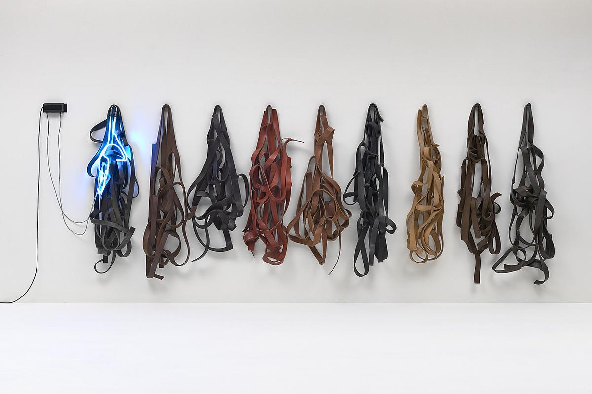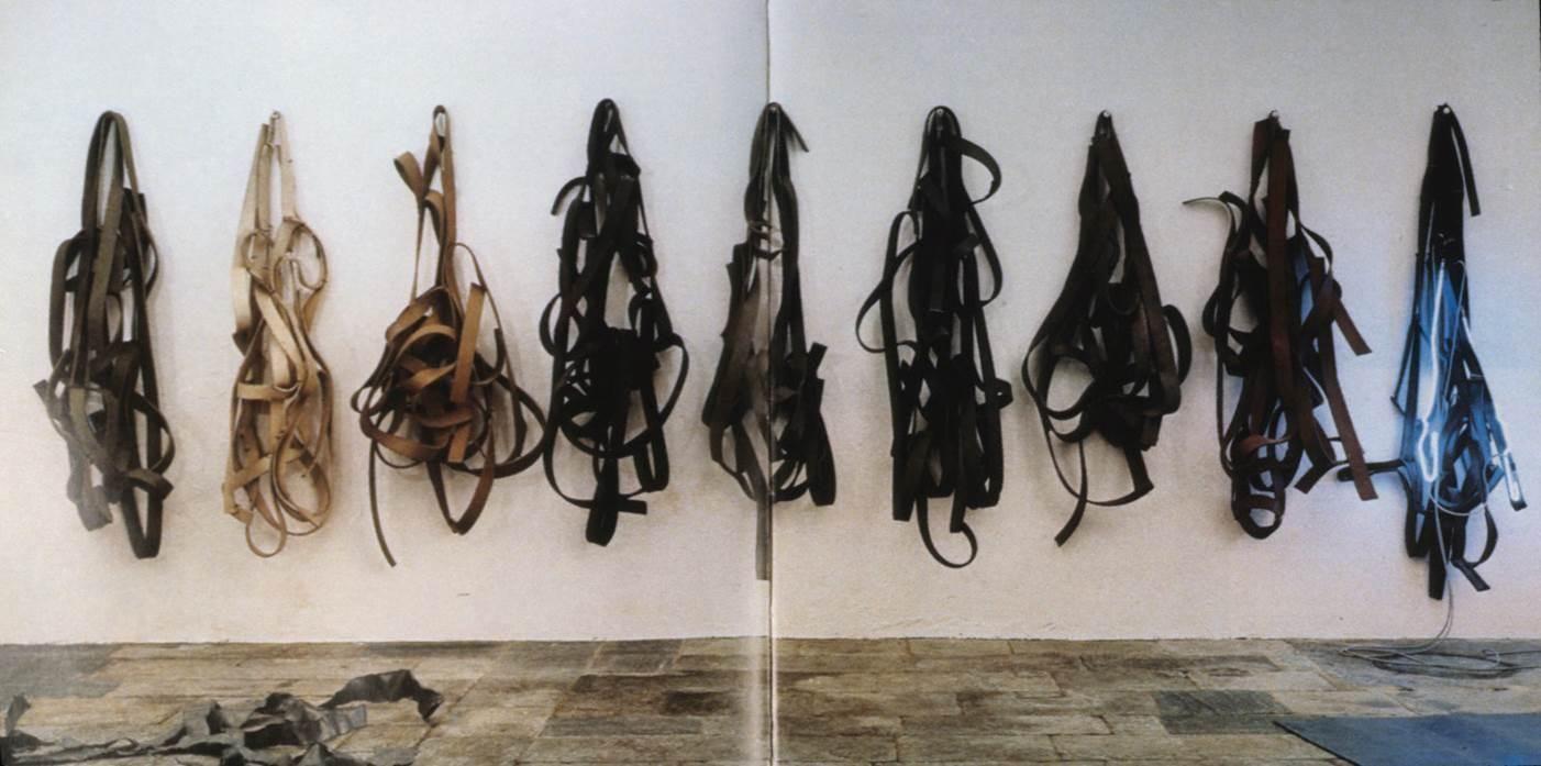 The Belt series was crafted from strips of vulcanized rubber and neon tubing, marking a departure from traditional sculpture materials to incorporate elements that emphasized the physical properties of gravity and flexibility. Serra was intrigued by the idea of drawing three-dimensionally in space, inspired by the action paintings of Jackson Pollock. He aimed to translate Pollock's dynamic gestural painting into three-dimensional forms using rubber that would naturally drape and unfurl due to its own weight. To further explore this concept, Serra manipulated these strips of rubber, joining them at intersections with bent nails, which resulted in a series of pieces that were both visually striking and structurally innovative (The Museum of Modern Art).