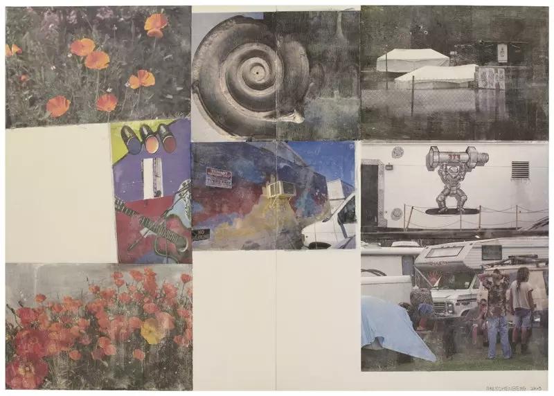 Robert Rauschenberg's "Scenarios" series, created between 2002 and 2006, represents a significant phase in the artist's late career, marked by a return to autobiographical and reflective themes. Utilizing a transfer process that he began in the early 1990s, Rauschenberg employed digital color images produced on an inkjet printer. These images were then transferred onto large polylaminate panels, often arranged in a grid-like format with significant areas of negative space, creating a distinct visual language compared to his earlier, more densely layered works (Rauschenberg Foundation) (Rauschenberg Foundation).