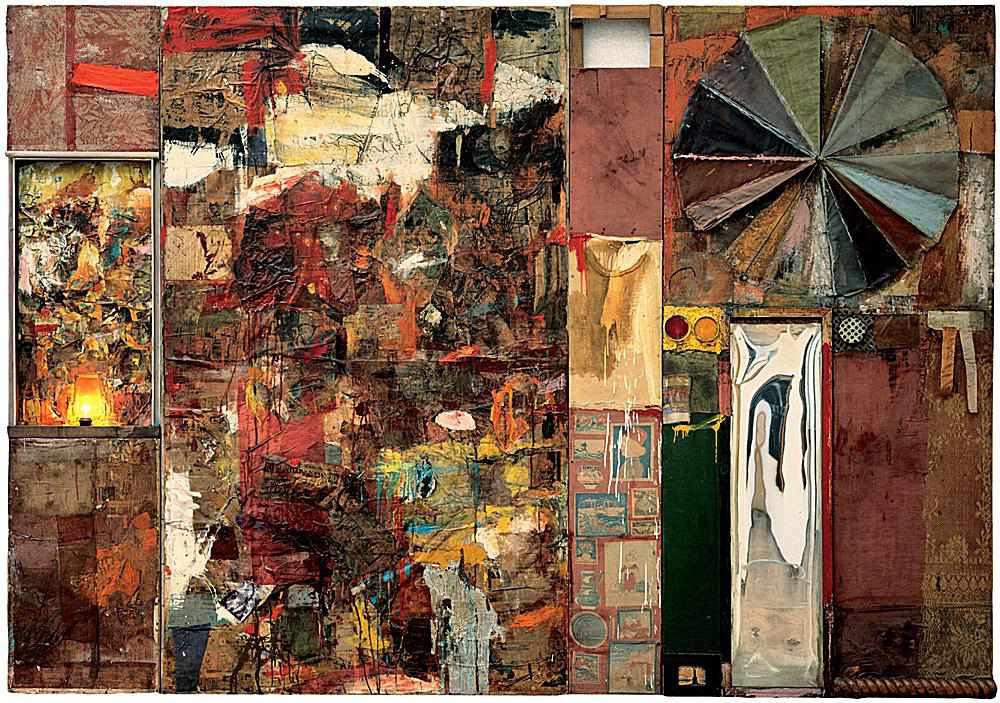 The surfaces of these Combines are irregular, covered with an array of materials such as comic strips, old photos, posters, and even items like wood, metal, and mirrors. This collage of materials creates a rich texture and depth, making each piece a complex visual experience that invites the viewer to explore and interpret the work in multiple ways. For instance, the use of a multicoloured fabric curtain in one of the Combines serves not just as a decorative element but as a functional part of the composition, demonstrating Rauschenberg's interest in the interplay between form and function, art and life (Centre Pompidou).