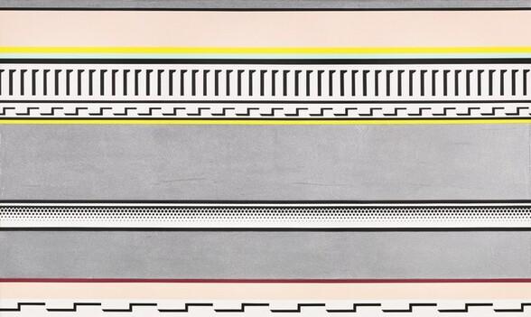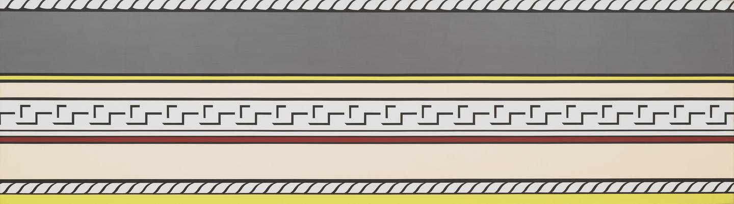 Roy Lichtenstein's Entablatures series, created between 1971 and 1976, is a thematic exploration inspired by the architecture of Lower Manhattan and the grand, neo-classical facades of Wall Street's buildings. Moving beyond his iconic comic strips and advertisements, Lichtenstein turned his attention to Classical motifs, reflecting upon hierarchies of taste and subverting the assumed power of these motifs. His work in this series dialogues with the mass imitation of Greco-Roman forms found throughout the American urban landscape.