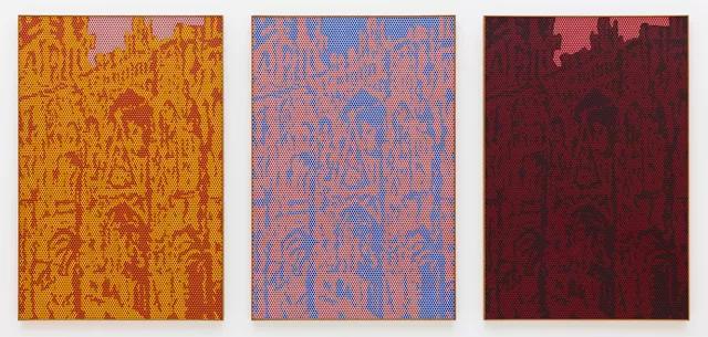 Roy Lichtenstein's Cathedrals series from 1969 is a fascinating exploration of seriality, perception, and the intersection between modernism and pop art. Inspired by Claude Monet's famous Rouen Cathedral paintings, Lichtenstein embarked on this series, drawing from the Impressionist's fascination with the cathedral's changing appearance under varying light conditions. Unlike Monet, who painted the cathedral on-site over two years, Lichtenstein did not paint from life but instead reimagined the cathedral using his distinct pop art language, consisting of primary colors and Benday dots.