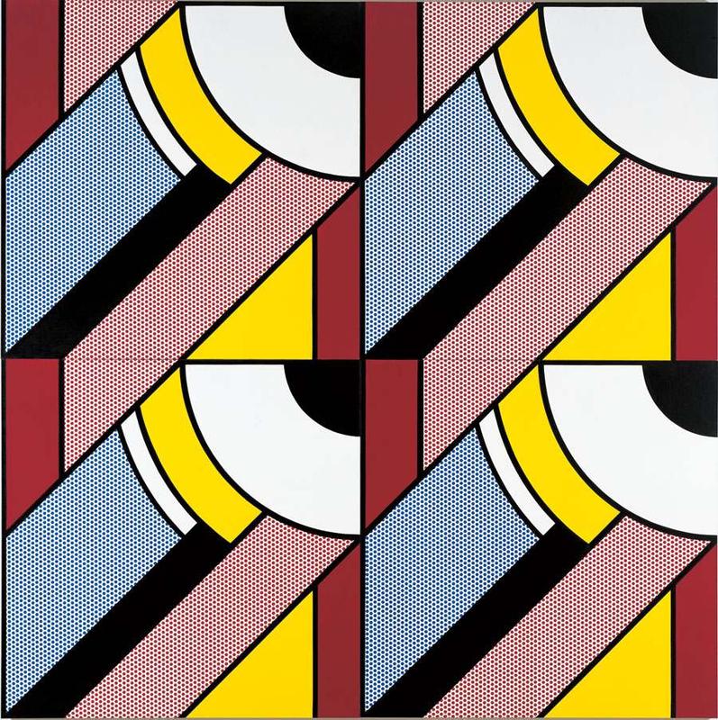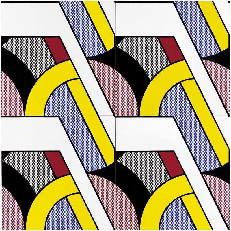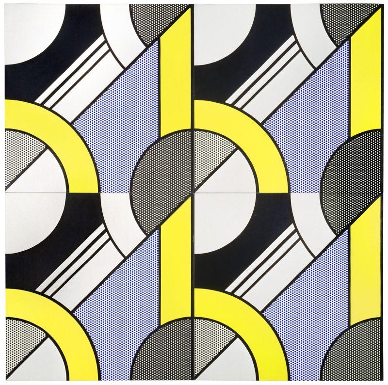 Roy Lichtenstein's Modular Paintings series showcases the artist's exploration of geometric abstraction and pop art aesthetics. In "Modular Painting with Four Panels, No. 7," part of his Modern Series created in 1970, Lichtenstein draws inspiration from the geometric Art Deco style of the 1930s, evident in settings like ocean liner lounges and theatre foyers, as well as commercial reproductions of Art Deco designs in mass media. This work exemplifies Lichtenstein's playful yet critical approach to art, using comic strip vocabulary—such as benday dots and stenciled shapes outlined in black—to parody the Art Deco fascination with technology and industry. Despite its humorous undertones, the painting critically addresses the postwar surge of commercial imagery in American culture, marking a significant statement within the Pop Art movement (Cranbrook Art Museum).