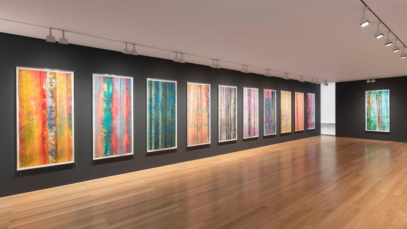 Sam Gilliam's exploration of paper as a medium for his abstract works is evident in two significant series that span different periods of his career. The "New Works on Paper" series, created in 2019 and exhibited at The FLAG Art Foundation, showcases Gilliam's process-based approach to abstract painting. These twelve large-scale works were made on Washi paper, a traditional Japanese paper known for its durability and texture. Gilliam soaked the paper in vibrant watercolor and acrylic paints, manipulating the folds and creases to create dynamic compositions that mirror each other rhythmically. The resulting pieces exhibit a sense of atmospheric depth and improvisatory color blending reminiscent of jazz, reflecting Gilliam's long-standing practice of using color freely to evoke the drama of music and colors coming together (The FLAG Art Foundation).
