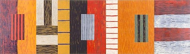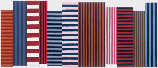 "Backs and Fronts" consists of 11 panels featuring colored stripes that seem to move optically across the canvas in different directions, akin to a musical score. This painting was inspired, in part, by Picasso's "Three Musicians" (1921), and it represents a significant departure from the hard-edged precision of tape lines to a more expressive, freehand application of paint. This shift towards visible brushstrokes and a more tactile approach to painting surfaces was a statement against the impersonal aesthetics of Minimalism, aiming to bring back the emotional and referential potential of abstract art (DailyArt Magazine).