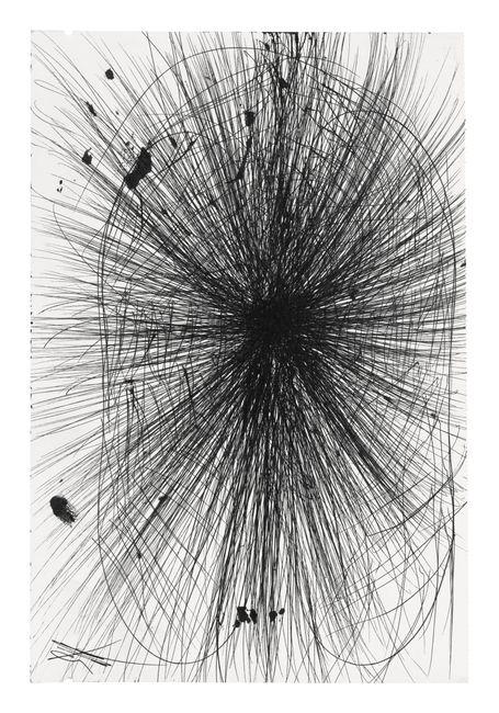 Sterling Ruby's drawings are a vital component of his diverse and multidisciplinary art practice, characterized by their raw and volatile energy. These monochrome works, executed in ink or graphite, represent an entirely new body of work for Ruby. They embody a spontaneous and expressive quality, capturing the same kind of raw, unfiltered emotion that poet Allen Ginsberg's words do on a page. This connection to the beat poet's "first thought, best thought" approach indicates a deeper philosophical engagement within Ruby's art, where intuition and immediacy play a critical role (Xavier Hufkens).