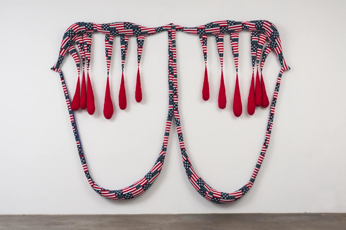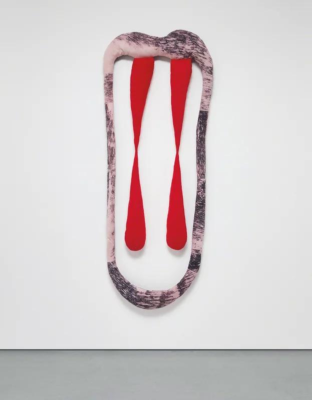 Sterling Ruby's Vampire series stands as a unique exploration within his broad and diverse artistic practice, which spans across ceramics, painting, collage, sculpture, and textiles, among other mediums. Known for his soft sculptures, Ruby's work in this series includes large vampire mouths and double vampire mouths crafted from fabric stuffed with fiber fill. These pieces feature fabric blood drops that hang from their fabric teeth, showcasing Ruby's interest in blending horror motifs with soft, approachable materials. The Vampire series, therefore, adds a gothic, yet tactile dimension to Ruby's exploration of form and material (Wikipedia).