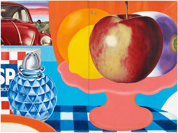 Throughout his Still Lifes series, Wesselmann's work evolved to include three-dimensional sculptural elements, further pushing the boundaries of the still life genre. This evolution is evident in his later works, such as "Still Life with Goldfish, Fruit and Tulips" (3-D, 1988), where he utilized cut-out aluminum painted with enamel to create vibrant, stand-alone pieces that exist in the space between painting and sculpture. These later still lifes underscore Wesselmann's continual experimentation with materials and form, as well as his enduring fascination with the interplay between the two- and three-dimensional (The Estate of Tom Wesselmann) (The Art Story) (Gagosian).