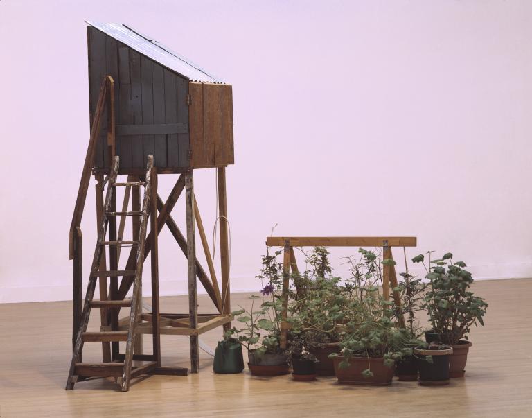 Tracey Emin’s “The Perfect Place to Grow” (2001) is a multifaceted installation that combines various elements to create a deeply personal and evocative piece. The work features a wooden birdhouse, a Super 8 film transferred to a DVD, a monitor, trestles, plants, and a wooden ladder. It was first exhibited at the White Cube gallery in 2001 and later at Tate Britain in 2004, where it was displayed in a room dedicated to Emin's work.