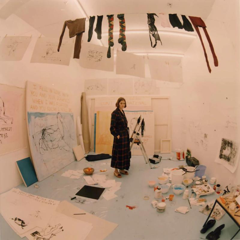 Tracey Emin's "Exorcism of the Last Painting I Ever Made" (1996) is a seminal work that stands out in her career for its raw autobiographical intensity and its unique performative aspect. This installation was created at Galleri Andreas Brändström in Stockholm, where Emin locked herself in a room for three weeks, working naked to confront her emotional and psychological barriers to painting. The process was visible to the public through fish-eye lenses embedded in the walls, allowing viewers to witness Emin’s intense and personal artistic journey (Christie's) ('Faurschou').