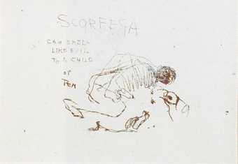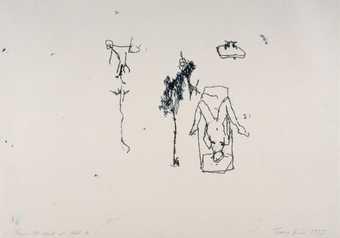Tracey Emin’s “Terribly Wrong” (1997) is a deeply personal monoprint that reflects her distinctive autobiographical style. This work, unlike traditional printmaking methods that allow for multiple copies, is a one-off image created by drawing on a piece of glass and pressing it against paper. The print captures a moment of raw vulnerability and is marked by backward lettering, suggesting the mirrored perspective one sees when looking at their reflection, thereby emphasizing self-examination and introspection.