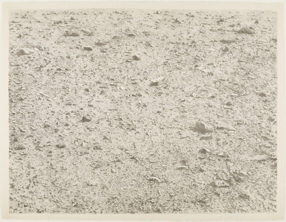 Vija Celmins' Desert Floor series, created primarily in the early 1970s, is a significant body of work that continues her exploration of natural surfaces and their intricate details. This series consists of detailed renderings of desert landscapes, focusing on the texture and vastness of the desert floor. Celmins meticulously translates photographs of these barren landscapes into graphite drawings, emphasizing the subtle variations in the terrain.
