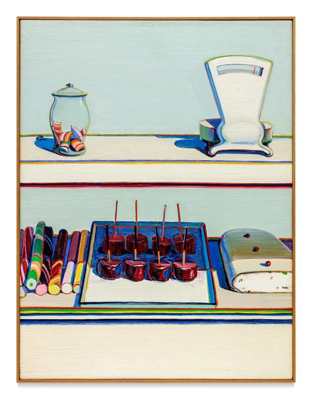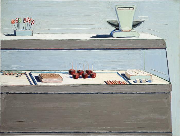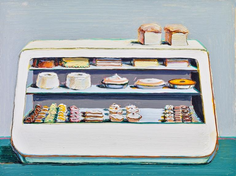 "Delicatessen Counter" is held in the collection of The Menil Collection in Houston, Texas. The painting, measuring 30 ¼ × 36 ¼ inches, is executed in oil on canvas. It is a testament to Thiebaud's ability to transform everyday scenes and objects into visually striking compositions that play with color, form, and perspective (The Menil Collection).