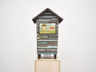 Yoshitomo Nara's "Our Thai House Mini," created in 2007, is a mixed media sculpture that encompasses a variety of components, including a wooden house structure, two wooden chairs and a bench, an acrylic on wood panel, an acrylic on cotton mounted on wood panel, two acrylics on canvas, and an electrical light fixture. The overall dimensions of the house sculpture are approximately 88 by 54 by 62.5 cm. This piece was signed and dated by Nara on the reverse of the acrylic elements, confirming its authenticity and connection to the artist's broader body of work.