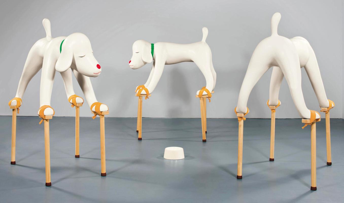 Yoshitomo Nara's "Dogs From Your Childhood," executed in 2000, is a captivating mixed media work featuring fibreglass-reinforced plastic and acrylic on canvas laid down on panel. The sculpture includes a whimsical depiction of a house and dogs, with dimensions for the house at approximately 101.5 by 210 by 60 cm and each dog measuring around 40 by 32 by 20 cm. This piece belongs to an edition of six and is part of Nara's broader exploration of themes of childhood, isolation, and companionship through the motif of dogs, which have been a recurrent symbol in his artwork.